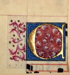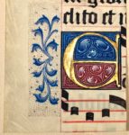 Initiale «C», dim. de l'initiale : 72 x 70 mm ; dimensions du fragment : 137 x 145 mm. Initiale à l'or bruni sur fond bleu et rose foncé avec rehauts blancs, bordure sur fond criblé avec décor de feuilles d'acanthe roses soulignées de blanc et petits disques à l'or bruni.