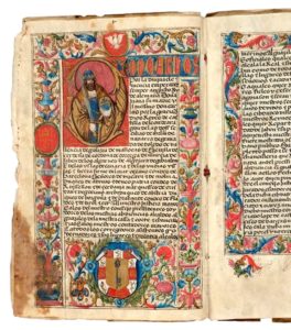 Les armoiries au verso du feuillet 2v en bas-de-page sont celles de la ville et place forte de Alcalá la Real, commune de la province de Jaen en Andalousie. Un temps partie du royaume musulman, Alcalá la Real fut reprise définitivement sous Ferdinand III de Castille puis sous Alphonse XI de Castille qui fonda au XIVe siècle une très importante abbaye, placée sous patronage royal, l'une des principales institutions ecclésiastiques andalouses, indépendante de tout pouvoir épiscopal.