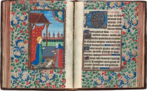 1 - Manuscrit copié et enluminé à Gand ou Bruges, sur des bases stylistiques avec des miniatures et un décor peint typiquesde l’enluminure ganto-brugeoise du XVe siècle. Une origine dans le sud des Pays-Bas (Gand, Bruges) est confirmée parle calendrier qui comporte plusieurs saints honorés à Gand et à Bruges (Bavon, Donat, Donatien, Quintin). Une prière àla Vierge est rajoutée en fin de manuscrit est en néerlandais : « Vrouwe heilighe moeder gods Maria... ».