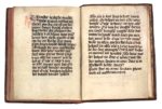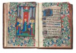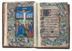 bridés (Masters of the Beady Eyes). — 102 ff., précédés et suivis de 3 ff. de garde de papier, complet [collation : i6, ii8+2 (avec i et vii des feuillets insérés avec miniatures), iii8, iv8+1 (avec viii un feuillet inséré avec miniature), v8, vi10, vii8+2 (avec v et x des feuillets insérés avec miniatures), viii8+2 (avec i et xi des feuillets insérés avec miniatures), ix8+1 (avec iii un feuillet inséré avec miniature), x8, xi8, xii6], écriture gothique à l'encre brune, parchemin réglé à l'encre rouge pâle (justification : 75 x 125 mm), 18 lignes par page, rubriques à l'encre rouge pâle, bout-de-lignes rose et bleu avec rehauts blancs et disques à l'or bruni, initiales de 1- à 2-lignes de hauteur à l'or bruni sur fonds bleu et rose foncé avec rehauts blancs, grandes initiales de 5-lignes de hauteur rose et/ou bleu avec décor blanc sur fonds d'or bruni serties d'un décor de rinceaux et fleurs bleus (introduisant les grandes divisions textuelles et liturgiques), bordures enluminées aux trois-quarts marquant les grandes divisions textuelles, composées d'un décor foisonnant de feuilles d'acanthe bicolores, de fleurs et petites baies, de feuillages soulignés de petits traits noirs et d'un semé de points noirs et petits disques à l'or bruni, décor sur fonds réservés, avec 13 GRANDES MINIATURES (certaines peintes sur des singletons insérés, d'autres faisant partie du cahier d'origine) et 1 PETITE MINIATURE, toutes inscrites dans des bordures enluminées aux trois-quarts (on notera qu'au momment de la reliure, les marges intérieures n'ont pas été rognées, laissant apparente une bande de parchemin blanc dans les marges intérieures des feuillets comportant des miniatures ou des bordures aux trois-quarts). ─ Reliure de plein veau brun granité, dos à 5 nerfs cloisonné et fleuronné, lettrage doré «Office de la Vierge», gardes de papier marbré tourniqué, tranches rouges. Quelques mouillures affectant certains feuillets, avec atteinte à quelques bordures (e.g. ff. 27, 41v, 42). Quelques repeints ou mains d'atelier (f. 13 : visage de la Vierge ; f. 32 : visage de l'ange ; f. 58 : visage du roi mage debout à gauche). ─ Dimensions : 135 x 185 mm. ♦ Ce manuscrit est un bel exemple de production gantoise ou brugeoise, l'atelier des Maîtres aux yeux bridés étant associé, selon les périodes, à Gand ou à Bruges. Le style des miniatures rappelle la production des Maîtres aux yeux bridés, un groupe d'artistes actifs à Gand vers 1450-1475, successeurs des Maîtres aux rinceaux d'or, auxquels on attribue plusieurs livres d'heures (New York, Columbia University, Benjamin ms. 5 ; Copenhague, Bibliothèque royale, ms. Addimenta 65 8° ; La Haye, ms. 76 K 7 (L. M. J Delaissé, La Miniature flamande, cat. expo. Bruxelles, 1959, n°101) ; Bruxelles KBR, ms. 10773 (Delaissé, 1959, n°128) et ms. 10776 (Delaissé, 1959, n°127) ; Paris, BnF, ms. lat. 1165. L'artiste se situe à Bruges ou à Gand, sans doute oeuvrant plus à Gand. Dans une étude de 2009 consacrée aux manuscrits de Cambridge Fitzwilliam Museum, N. Morgan et S. Panayotova attribuent aux Maîtres aux yeux bridés les manuscrits suivants : 1-1974 daté vers 1450-1460 (notice 181), le ms. 142 daté vers 1460 (notice 183), ms. 50 (notice 192) et Clare College ms. KK. 3.1 (notice 185), ms. KK. 3 (notice 186) (voir Morgan et Panayotova, 2009). Le groupe d'artistes dits «Maîtres aux yeux bridés» (Masters of the Beady Eyes) est ainsi nommé d'après leur technique particulière de peindre les yeux : ceux-ci sont tracés au moyen de petits traits noirs sertis d'un petit disque pour la pupille. Ces artistes sont à relier avec les ateliers des Maîtres aux rinceaux d'or à Bruges mais semblent avoir officié plutôt à Gand. Sur ces artistes on consultera L.M.J. Delaissé (La miniature flamande, 1959, pp. 18, 30, 99) qui fut le premier à reconnaître ces artistes et leur traitement caractéristique des yeux «bridés». Ces artistes ont beaucoup produit, notamment pour l'export. Rappelons que Bruges et Gand étaient des places importantes d'enluminure : la pratique de manuscrits copiés et peints en Flandre pour exportation en Angleterre, en Espagne et en France, prendra son essor et se généralisera ensuite tout au long du XVe siècle (sur cette pratique de manuscrits réalisés à Bruges et Gand pour exportation, voir les travaux de E. Colledge, «South Netherlands Books of Hours Made for England», Scriptorium, 32, 1978, p. 55-57 ; N. J. Rogers, «Patrons and Purchasers : Evidence for the Original Owners of Books of Hours Produced in the Low Countries for the English Market», Als ich can. Liber Amicorum in Memory of Professor Maurits Smeyers, éd. B. Cardon et alia, Louvain, 2002, vol. II, p. 1165-1181).