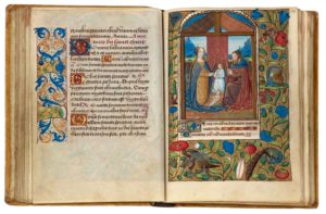 ff. 21v-56v, Heures de la Vierge selon l’usage de Rome, rubrique, Sequuntur hore beate marie virginis secundum usumromanum ; avec matines (ff. 22-28v) ; laudes (ff. 29-36) ; matines de la Croix (ff. 36v-37v) ; matines des Heures du Saint-Esprit [sans miniature : elle n’était pas prévue] (f. 37v) ; prime (ff. 38-41), avec antienne, Assumpta es et capitule, Que estista ; tierce (ff. 41v-44) ; sexte (ff. 44v-46v) ; none (ff. 47-49v), avec rubrique annonçant à tort « Ad vesperas » ; vêpres (ff. 50-53) ; complies (ff. 53v-56v ; sans miniature, section annoncée au bas du fol. 53 par une rubrique) ;