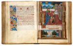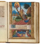 f. 80, Job sur son fumier, raillé par ses amis (Office des morts ; grande miniature, dimensions : 100 x 65 mm) [enlumineur : Robert Boyvin ; bordure enluminée de Jean Serpin] ; f. 99v, Trinité (Début des Suffrages ; grande miniature, dimensions : 84 x 65 mm) [Maître de Robert Gaguin] ;