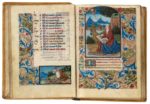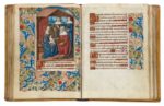 (Robert Boyvin et Jean Serpin) et deux artistes parisiens le Maître de Robert Gaguin (actif à Paris dans le dernier quart du XVe siècle jusque vers 1500) et le Maître des entrées parisiennes (actif à Paris de 1500 à 1520) [à noter que deux petites miniatures sont sans doute peintes par le Maître d'Etienne Poncher]. — 116 ff., précédés et suivis d'un feuillet de garde de parchemin, sans miniature prévue pour complies des Heures de la Vierge [collation : i6, ii6, iii8, iv8, v8, vi8, vii8, viii8, ix6, x8, xi8, xii8, xiii9 (8+1, feuillet inséré entre ff. 82 et 83 ; réclame perceptible), xiv7 (8-1, manque un feuillet entre ff. 98-99), xv11 (12-1, manque i, sans doute un feuillet blanc annulé : ce cahier est copié par une main différente), xvi7 (8-1, manque viii, certainement un feuillet blanc)], quelques réclames horizontales, écriture bâtarde calligraphique (deux modules, une écriture plus petite), seconde main pour un cahier (ff. 99-109v), texte sur une colonne, jusque 20 lignes par page, réglure à l'encre rouge pâle (justification : 70 x 95 mm), certains passages soulignés en rouge, rubriques rouge foncé, bout-de-lignes en rouge foncé avec décor à l'or liquide, initiales en rouge foncé (quelques-unes sur fond bleu) avec décor à l'or liquide (1- à 2-lignes de hauteur), quelques initiales peintes en bleu ou mauve avec rehauts blancs sur fonds d'or avec motifs floraux (2- à 3-lignes de hauteur), bordures droites compartimentées à toutes les pages, avec décor de feuilles d'acanthe bicolores, fleurs, fruits et petit points dorés, ces mêmes bordures sur quatre côtés sur les pages avec miniatures à l'exception des feuillets 22 et 67 avec les miniatures inscrites dans des encadrements architecturés dorés avec sculptures en pied dans des niches, et à l'exception des feuillets 38 et 80 qui présentent des bordures plus abouties (Jean Serpin) avec des fleurs au naturel, des animaux et grotesques sur fonds d'or, avec 13 GRANDES MINIATURES (deux compositions (ff. 22 et 67) contiennent en bas de page des scènes auxiliaires, ce qui explique le décompte erroné de 45 petites miniatures inscrit au verso de la première garde) et 43 PETITES MINIATURES (dont 24 au calendrier). ─ Ce manuscrit de facture rouennaise est achevé ou continué par trois artistes parisiens. Un examen appliqué de la mise-en-page révèle que si le manuscrit fut effectivement peint en Normandie, il reçoit de manière quasi contemporaine des ajouts par des artistes parisiens. ─ Reliure de parchemin rigide (XIXe siècle), dos lisse, ornée de fleurons dorés et filets, triple encadrement sur les plats de filets dorés avec fer central doré, tranches dorées. Bon état général : signalons quelques taches au parchemin mais seulement dans les marges. Miniatures en très bel état de conservation. Quelques frottements à la reliure, tache sur le plat inférieur. ─ Dimensions : 120 x 165 mm. ─ Manuscrit avec un cycle important de 56 miniatures, oeuvre de collaboration entre Rouen et Paris, témoignage des échanges entre les deux villes à la fin du XVe siècle. Ce manuscrit est une oeuvre de collaboration, entre artistes de deux villes à savoir Rouen et Paris : il apparait que le manuscrit fut commencé à Rouen, puis «terminé» ou «achevé» de manière quasi-contemporaine à Paris. L'essentiel du manuscrit est peint par un artiste rouennais, dont l'identité nous est connue, Robert Boyvin (actif à Rouen de 1486 à circa 1520 (ou plus tard dans les années 1530 ?)). On remarque aussi la main d'un second artiste, «vignetteur» c'est-à-dire spécialisé dans la décoration des bordures, Jean Serpin (actif aussi à Rouen vers 1500-1520). Ces artistes normands ont donc assuré l'essentiel des présentes Heures, notamment toutes les grandes miniatures pour le péricope évangélique selon Saint Jean, les Heures de la Vierge, les Psaumes de la Pénitence et l'Office des morts (à l'exception du Songe du chanoine Arnoul (fol. 110) et la grande Trinité (fol. 99v) au commencement des Suffrages. Il faut replacer ce livre d'heures, fort original, dans le cadre des relations entre les villes de Rouen et de Paris, avec d'un côté les enlumineurs au service du Cardinal d'Amboise - notamment Robert Boyvin et Jean Serpin et de l'autre les artistes parisiens dans la lignée du Maître de Robert Gaguin, héritier du Maître de Jacques de Besançon, et le Maître des entrées parisiennes en association avec le Maître d'Etienne Poncher. → Robert Boyvin est un artiste - dit «historieur» dans les comptes - dont la personnalité et l'importance pour l'histoire des manuscrits enluminés ont récemment été remis en lumière (E. Adam, «Retour sur l'oeuvre de Robert Boyvin, enlumineur à Rouen vers 1500», dans Peindre à Rouen au XVIe siècle, dir. F. Elsig, 2017, pp. 101-119 ; voir aussi les travaux pionniers d'Isabelle Delaunay). → Robert Boyvin est formé à Rouen, et semble avoir été inspiré des modèles et compositions d'artistes rouennais antérieurs, notamment le Maître de l'Echevinage de Rouen. Installé «à la quatrième échoppe du côté de l'archevêché au portail des libraires », enlumineur prolifique et fécond, on conserve au dernier recensement quelquesquatre-vingts manuscrits de sa main, dont plusieurs sont dits « livres d’étal » vendus dans son échoppe mais dont d’autres sont des « livres de commande » personnalisés pour un commanditaire (voir Adam,, 2017, p. 104). Elliot Adam, dans sonétude récente, rend bien compte de l’importance de Boyvin pour l’art de l’enluminure sous Louis XII : « Pourtant, lesuccès rapide que connut la facture traditionnelle de Robert Boyvin dans les années 1490 et son adaptation difficile aucontexte des années 1510, marquées par l’adoption croissante du goût à l’antique, font de lui un témoin privilégié de la période hybride que constitue le règne de Louis XII pour les arts de la couleur en France 
