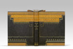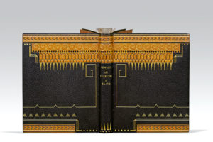de maroquin brun placés en losange et d’une rangée de points dorés, chaque carré bordé par des jeux de cinq filets à froid, encadrement intérieur orné de filets à froid, doublure de deux dessins originaux sur soie dorée et peinte, gardes de reps brun, tranches dorées sur témoins, couverture et dos, étui (G. Cretté, succ. de Marius Michel).