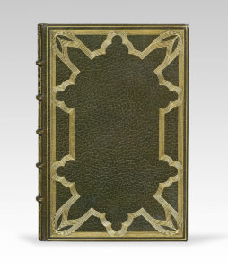 une large bordure de rinceaux gothiques, gardes de moire verte, tranches dorées sur témoins, couverture et dos, étui (H. Blanchetière).