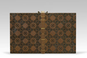 entre deux listels, occupant le centre un très large cadre orné de filets noués formant des compartiments occupés par une rosace de maroquin rose, gardes de soie marbrée rouge, tranches dorées sur témoins, couverture et dos, étui (Weckesser et ses fils).
