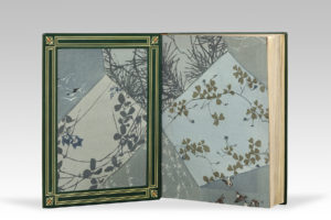 maroquin ocre serti d’un filet doré, gardes de soie verte, tranches dorées sur témoins, couverture et dos, chemise demi-maroquin, étui (A.P. Pourrieux).