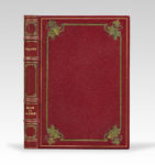 et argent le titre Histoires en maroquin blanc sur la partie noire, sur l’autre plat le début du titre Quinze en lettres noires sur la partie blanche, la division en noir et en blanc se poursuit sur la doublure et sur les gardes de moire, tranches dorées sur témoins, couverture et dos, étui (Jeanne Langrand 1931).
