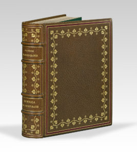 mosaïquées dans un camaïeu de rose, doublure de maroquin bleu orné d’une bordure dessinée au filet doré avec une légère mosaïque de fleurs et de feuillage d’or, gardes de reps brique, tranches dorées, couverture et dos, chemise papier, étui (Gruel).