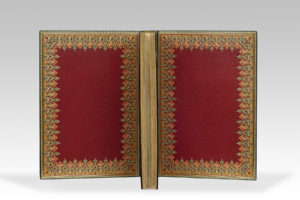 STENDHAL. — Le Rouge et le noir. — Réimpression textuelle de l’édition originale. — Paris, L. Conquet, 1884. — 3 volumes in-8, maroquin rouge, quadruple filet doré dont un perlé, fleuron aux angles, dos orné de même, dentelle...