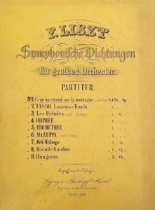 Premières éditions des cinq premiers Poèmes symphoniques en partitions d’orchestre, gravées en « petits formats », selon l’ordre et les titres en français établi par l’éditeur et le compositeur : Ce qu’on entend sur la montagne (nach V. Hugo) : pl. 9382, couverture jaune citron, 168 pp. Tasso : pl. 9136, couverture verte, 79 pp. Les Préludes (nach Lamartine) : pl. 9056, couverture lilas, 97 pp. Orphée : pl. 9066, couverture lilas passé, 40 pp. Prométhée : pl. 9191, couverture bleue, 82 pp. Très bel état, petits accidents aux couvertures d’origine, fragiles par destination.