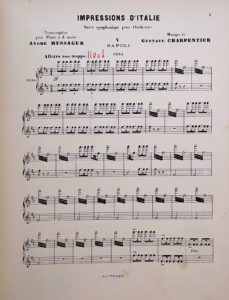 Gustave CHARPENTIER. Impressions d’Italie, suite pour orchestre, transcription pour piano à 4 mains par André Messager, Heugel, 1912, « à Monsieur Ludwig Bisschopnick, en affectueuse sympathie, fév. 1930 », volume cartonné, couv. illustrée par Clairin, avec une large découpe de l’enveloppe d’expédition rédigée par le compositeur. Gabriel DUPONT. Les Heures dolentes. Heugel, 1905, « à Madame Trélat, souvenir de très respectueuse affection. Mars 1906 ». Traces de scotch. Jean RIVIER. Trois pointes sèches. Pierre Noël, 1952, « à Jean Boguet, à la fois bon technicien et « musicien » dans toute l’acception du terme.. ». Henri SAUGUET. Trois nouvelles Françaises (Françaises 4-5-6). Rouart Lerolle, 1925, in folio, en feuilles, envoi autographe signé « à Mademoiselle Chailley-Bert, 25-1-26 », couv. déf. On joint : Samuel ROUSSEAU. Acrostiche, mélodie piano et chant sur un poème d’E. Haraucourt, Le Beau, c. 1900, 3 pp., envoi autographe signé « à Madame Le Tourneux, respectueux hommage. »