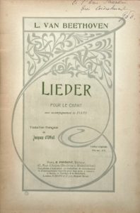 Ensemble de 9 partitions dédicacées et signées, offertes à Walther Straram, huit volumes in-quarto, reliées demi-basane (sauf mention) au chiffre W.S. doré en queue : 101 Magyar Nepdal. Budapest, Rozsnyai, c. 1909, demi-toile bleue. 101 chants populaires hongrois. Envoi autographe signé du Dr Alexandre Kuthy-Terly à Walther Straram en couverture. Beethoven. Lieder, édition originale avec les paroles françaises (Paris, Fromont, 1905) ; Envoi a.s. du traducteur Jacques d’Offoël à Walter Straram. Elgar. Le Songe de Gérontius. Londres, Novello, 1905. Traduction française de J. d’Offoël, qui a orné l’exemplaire d’un envoi autographe signé « A l’ami Straram. Très cordialement. » Robert Franz. Le Lied allemand moderne. 10 Mélodies (1er recueil) et 10 Mélodies. Traduction française par Jacques d’Offoël (Leipzig, Breitkopf und Härtel, Siegel, c. 1910) ; 2 tomes reliés en un volume demi-toile grise au chiffre W.S., 34 et 35 pp. Envois autographes signés du traducteur à Walter Straram en pages de titres. Joseph Haydn. Sonaten für Pianoforte und Violine. Leipzig, B. und H., 1930, in-4, 29 pp., violon seul. Ralph Lyford. Castle Agrazant. Grand Opera. Cincinnati, Ohio, Lyford, 1922, couverture illustrée conservée, 211 pp. Édition originale de la réduction piano / chant édité par l’auteur, avec un bel envoi a.s. « To my most valued friend and colleague of the original Boston Opera Co. 1909-14. In sincerest friendship. Compliment of the composer. Sept. 1926 ». Dos lég. déf. W.A. Mozart. La Clemenza di Tito. Leipzig, Peters, c. 1900) Offert à Straram par un de ses élèves, avec la dédicace autographe « à mon cher maître, en grande reconnaissance pour les magnifiques lessons [sic], son dévoué élève [signature indéchiffrable] ». Gösta Nyström. Regrets. Paris, Sénart, 1928, in-folio, broché, 43 pp. Édition originale de la partition d’orchestre avec un envoi a.s. du compositeur à W. Straram. Traces d’humidité. Bedrich Smetana. Libuse. Prague, Umelecka beseda v Praze, 1917. Réduction piano et chant. Envoi autographe signé de Charles Bächern « En souvenir d’inoubliables moments passés ensemble et expression de ma vive admiration. 31. XII. 20 ».