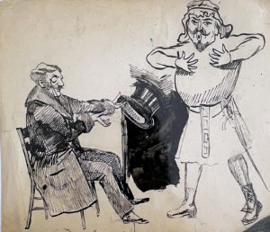 Très bel ensemble de portraits pris sur le vif, caricatures, jeux de mots dessinés…(voir n°72 pour des éléments de la biographie d’André Gresse) : « Une vieille habituée des Concours du Conservatoire 1933 » (mine de plomb), « Melle Ducasse impression 1933 » (mine de plomb), « Duc d’Albe, Patrie, 4ème Acte, Opéra, Réouverture 9 décembre 1925 » (encre violette, crayons de couleur), Sans titre (encre de Chine, chanteur, debout en costume de scène, et professeur de chant assis en redingote, guêtres et haut de forme), sans titre (aquarelle, dans un rôle wagnérien, Wotan ?), « Le Freyschütz, Gaspard » (mine de plomb), « Frère Michel, Portier des Trappistes de Chimay » (crayons noir et couleurs), « Sancho Pança » (crayon, encre violette, deux petits formats), « Lestelly, Parsifal » (crayon gras), « Decharme » (chanteuse en pastel rouge), « Le veau d’or » (un veau au crayon gras…), « Le type classique du Bistro, Le Père Gatti, Savorgnan de Brazza, Gustave Charpentier » (quatre portraits à l’encre de Chine sur le même petit feuillet), Sans titre (trois portraits à l’encre de Chine sur le même feuillet), « Autant de plis à son turban, autant de rides à son front ! (inutile de compter !) » (Profil au crayon gras), « et celui-ci, mein Gott ! » (autre profil au crayon gras), « Bacchus de Massenet, étude pour le gd Brahmane » (profil au crayon noir), « Le monsieur respectable » (crayons noir et bleu), « Critique musical (un ami) 1934 » (crayon gras), sans titre (crayon gras et aquarelle, le même ?), « étude de Pluton » (pastels), « Sans titre » (aquarelle, un pirate), « Quelques chefs d’orchestre : Georges Marty, Paul Vidal, Mangin, le père Lotin, Koenig, Alfred Bachelet » (six portraits à l’encre de Chine sur le même feuillet, petit manque en marge), « Souvenir de la Fourmi, 27 décembre 1920 » (encre violette), Sans titre (portrait charge d’avocat ou de juge ? encre violette et crayon rouge). Bel état général.