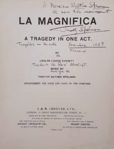 Né à New York, Timothy Mather Spelman a longtemps résidé en Italie près de Florence, où il a composé la majeure partie de son œuvre, principalement pour formations de chambre, ainsi que quelques opéras. Ses « Giorni Santi », sorte de poèmes symphoniques ont intitulés Sorrento, Venice, Siena et Assisi. Il a légué ses archives à la John Hopkins University. On propose les œuvres suivantes : Christ and the blind Man. New York, The H.W. Gray company, 1921, grand in-4, agrafé, 52 pp. Premier tirage de la partition d’orchestre portant la mention « Partition corrigée 1933 » et des corrections musicales dans le texte de la main de l’auteur, ainsi qu’un envoi autographe signé à Walther Straram. Saints’ Day. London, Chester, 1926, petit in-folio, demi-basane bleu-nuit au chiffre W.S., couvertures conservées, 211 pp. Premier tirage de la partition d’orchestre, ornée en page de titre d’un envoi autographe signé du compositeur à W. Straram daté « August 1928 ». On joint une L.A.S. (2 pp.) de Spelman à Staram à propos de cette partition et des tempi, ainsi que : Christ and the blind Man (New York, The H.W. Gray company, 1921) ; in-4, agrafé, 30 pp. Premier tirage de l’arrangement pour piano à 4 mains, par l’auteur, qui a orné la page de titre d’un bel envoi autographe signé à W. Straram. Celui-ci a travaillé la partition (annotations au crayon rouge, deux collettes intérieures pour remplacer les agrafes défectueuses). La Magnifica (London, Chester, 1924) ; grand in-quarto, broché, 159 pp. Édition originale de la partition arrangée pour chant et piano par le compositeur de cette « tragédie en un acte » sur un livret de Leolyn Louise Everett, son épouse. Bel envoi autographe signé à Walther Straram, pour qui Spelman a, de sa main, entièrement traduit en français les paroles et les indications musicales de la partition. Beau document, impeccable intérieurement, dos recollé. Et une belle L.A.S. (5 pp.) du compositeur à W. Straram à propos de La Magnifica.