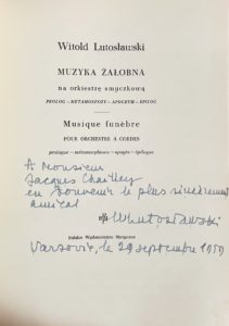 Premier tirage de la partition d’orchestre de cette « Musique funèbre pour orchestre à cordes » (traduction opportunément donnée dès la page de titre). Beau portrait photographique, en frontispice, du compositeur qui signe un chic envoi autographe signé : « à Monsieur Jacques Chailley, en souvenir le plus sincèrement amical, Varsovie, le 19 septembre 1959 ». Bel état général. On joint, par patriotisme musical (un paradoxe…) : Karol SZYMANOWSKI. IV Symfonia koncertujaca op. 60. Varsovie, PWM, 1957, in folio, broché, 62 pp. « WIciag fortepianowy », c’est-à-dire bien entendu « réduction pour piano » (par Grégoire Fitelberg) de cette quatrième symphonie concertante pour piano et orchestre (Par chance, Jacques Chailley avait traduit les intitulés polonais, en quelques collettes tapées). Est jointe une lettre tapée et signée d’Henri Musielak à Jacques Chailley (1977) à propos de cette symphonie, « un bon exemple de la musique polonaise contemporaine ».