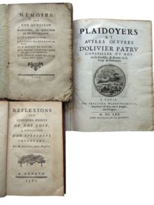 5. [DROIT]. Réunion d ‘ouvrages : • PATRU (Olivier). Plaidoyers et autres Œuvres. Paris, Sebastien Mabre-Cramoisy, 1670. In-4, reliure de l’époque veau brun, dos à 5 nerfs orné. Épidermures, mors du second plat en partie fendu, coiffes arasées, coins usés (l’un plié). (12)-741-(1) pp. Trace de mouillure en marge supérieure, plus étendue en fin d’ouvrage. Marque de l’imprimeur en page de titre, bandeau et cul-de-lampe gravés par François Chauveau. Édition originale de ce recueil de Plaidoyers d’Oliver Patru (1604-1681). Premier juriste admis à l’Académie française, il fut l’initiateur de la tradition des discours de remerciements. • KORNMAN (Guillaume). Mémoire sur une Question d’Adultère, de Séduction et de Diffamation Pour le Sieur Kornman. Contre la Dame Kornman, son Epouse. Le Sr. Daudet de Jossan Le Sr Pierre-Augustin Caron de Beaumarchais et M. Lenoir, Conseiller d’Etat & ancien Lieut.-Général de Police. S. l., s. n., 1787. In-8, broché. Couverture d’attente (mauvais état). Qq. rousseurs, petite mouillure en pied. Célèbre procès intenté par le banquier Kornman à sa femme et son amant pour adultère ainsi qu’à Beaumarchais, défenseur de Mme Kornman, et au lieutenant de police pour diffamation et complicité d’adultère. Beaumarchais fut innocenté et Mme Kornman obtint en 1793 le divorce - dont la loi venait d’être promulguée en sept. 1792. • SERVAN. Réflexions sur quelques Points de nos Loix, a l’occasion d’un événement important. Genève, s. n., 1781. In-8, reliure de l’époque basane marbrée, dos lisse orné. Mors épidermés, coiffes et coins usés. (4)-xxiv-234 pp. Ces Réflexions sur la réforme de la justice furent publiées à l’occasion du procès de M. de Vocance, conseiller au Parlement de Grenoble, accusé d’avoir empoisonné son hôte l’abbé de Bouvard.