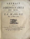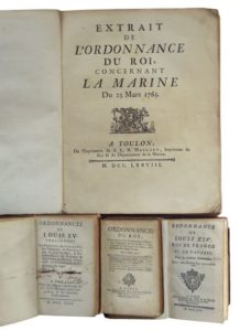 6. [DROIT]. ORDONNANCES. Réunion d’ouvrages : • Ordonnance du Roy, concernant les Gouverneurs & Lieutenans Généraux des Provinces, les Gouverneurs & Etat-majors des Places, & le Service dans lesdites Places. Du 25 Juin 1750. Avec l’ordonnance pour l’Uniforme des Officiers Généraux… Paris, Prault Père, 1762. In-16, reliure basane marbrée, dos à 4 nerfs. Épidermures, mors fendillés, coiffes et coins usés. (8)-314 pp. • Ordonnance de Louis XIV… pour les Matières Criminelles (mot rayé remplacé par) Civiles (manuscrit) Donnée à Saint Germain en Laye, au mois d’Avril 1667. Paris, chez les Associés… 1754. In-16, reliure basane marbrée, dos lisse orné. Manques en tête du dos et sur les coupes, pièce de titre manquante, coins usés. Bon état intérieur. • Ordonnance de Louis XV, concernant les Donations, les Insinuations, les Testamens… Paris, chez les Associés… 1742. In-16, reliure basane marbrée, dos lisse orné. Coiffe supérieure arasée, frottements sur les coupes. (6)-251-(4) pp. • Extrait de l’Ordonnance du Roi, concernant la Marine du 25 Mars 1765. Toulon, J. L. R. Mallard, 1778. In-4, broché, couverture d’attente papier à la cuve (usé au dos), en partie débroché. 159 pp. Légère trace de mouillure en marge des 5 premiers ff. Exemplaire sur papier fort à grandes marges.