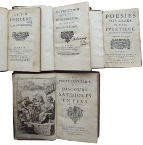 8. ÉDITIONS XVIIe siècle - LITTÉRATURE. Réunion d’ouvrages dont : • [CHETARDIE (Chevalier de La)]. Instruction pour une jeune Princesse, ou L’Idée d’une Honneste Femme. Paris, Theodore Girard, 1684. In-12, reliure de l’époque veau brun, dos à 5 nerfs orné. Mors fendus, coiffes usées. (10)-129-(2) pp. • FURETIÈRE (Antoine). Poësies Diverses. Seconde édition augmentée & corrigée. Paris, Guillaume de Luyne, 1664. In-12, reliure de l’époque veau brun, dos à 4 nerfs orné. Épidermures, mors fendus, coiffes, coupes et coins usés. 219-(6) pp. Frontispice gravé. Ex-libris manuscrit caviardé en page de garde. Trace de mouillure marginale sur les deux premiers ff., qq. rousseurs. L’édition originale est parue en 1655. • [GACON (François)]. Le Poëte sans Fard ou Discours Satiriques en Vers. Cologne, Corneille Egmont, 1697. In-12, reliure de l’époque veau brun, dos à 4 nerfs orné, chiffre couronné de Loménie de Brienne aux angles des plats. Épidermures nombreuses, coiffe supérieure, coupes et coins usés en tête. (4)-207 pp. Petites traces de mouillure marginales, qq. rousseurs. Édition originale. • [LESAGE]. ARISTENETE. Lettres Galantes. Traduites du Grec. Rotterdam (Chartres), Daniel de Graffe, 1695. 2 parties en un volume in-12, reliure de l’époque veau brun, dos à 5 nerfs orné. Mors du premier plat en partie fendu, coiffes et caisson de tête en partie manquants. 164 pp. Petite galerie de ver en marge interne sur la moitié du volume touchant qq. lettres. Rare édition originale de ces Lettres galantes, attribuées à l’écrivain grec Aristénète, dans la traduction de Alain-René Le Sage. • RONDEL (Jacques du). La Vie d’Épicure. Paris, Cellier, 1679. Suivi de : CHARPENTIER (François). La Vie de Socrate. Seconde édition, reveuë & augmentée. Paris, Anthoine de Sommaville, 1657. In-12, reliure de l’époque veau brun, dos à 5 nerfs orné. Petite fente au départ d’un mors, coins émoussés. (10)-81-(2)-(20)-300-(33) pp. Avec un portrait de Socrate en médaillon dans le texte. • TASSO (Torquato). Delle Rime, et Prose del Sig. Torquato Tasso. Parte Seconda. Ferrara, Giulio Vasalini, 1585. In-12, reliure vélin souple, titre à l’encre au dos. Qq. traces d’usure, liens d’attache manquants. (10)-(12)-(2 bl.)-113-263-(3)-83-(9)-30 pp. Trace de mouillure en angle, petite galerie de ver sur qq. ff. Ex-libris manuscrit à trois reprises : Boileau (homonyme). Ce deuxième volume des Rime et Prose est une réimpression de l’édition de 1583, exécutée d’après l’édition aldine de 1582.