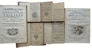 9. ÉDITIONS XVIIe siècle - HISTOIRE & SOCIÉTÉ. Réunion d’ouvrages : • ARNAUD d’ANDILLY (Robert). Lettres. Paris, Ribou, 1668. In-12, reliure veau brun, dos à 5 nerfs orné de fleurons fleurdelysés, coiffes arasées, fente de 4 cm en pied du mors du second plat, coins usés. (12)-456 pp. Signature en page de titre. • [BASNAGE de BEAUVAL]. Histoire des Ouvrages des Sçavans. Janvier - Avril 1688. Rotterdam, Reinier Leers, 1688. In-12, reliure veau brun, dos à 5 nerfs orné. Mors fendillés. 551-(20) pp. Bon état intérieur. Ex-libris : Colonel Féry et Charles Martyne. • BRESSAI (Gui de). La Paix de la Haie copiée par Gui de Bressai. Paris, chez Galiot Duprez, depuis l’an 1538 jusqu’à l’an 1698. In-12, broché, couverture papier. 24 pp. Titre à la sphère. • BOURDALOUË (Père). Eloge Funebre de tres-haut, tres-puissant et tres-excellent Prince Henri de Bourbon Prince de Condé, et premier Prince du Sang. Prononcée à Paris le 10. jour de Décembre 1683 … Paris, Mabre-Cramoisy, 1684. Suivi de : BOCHART de SARON (Abbé). Oraison Funebre de tres-haut, tres-puissant et excellent Prince Philippe Fils de France, duc d’Orléans, Frère unique du Roy. Prononcée le 31 d’Aoust 1701, dans l’Eglise de l’Abbaye Royale du Val de Grace, où son cœur repose. Paris, Jean Moreau, 1701. 2 ouvrages en un volume in-4, détachés d’une reliure recouverte de parchemin, dos à 5 nerfs, pièce de titre maroquin bordeaux. Un 3e texte a été retiré de la reliure. (2)-63-(1) pp. et (2)-31 pp. Une vignette de titre et un en-tête gravés par Sebastien Le Clerc, une lettrine et un cul-de-lampe non signés dans le premier texte une vignette de titre, un en-tête et une lettrine sur bois gravés dans le second. Ex-libris gravé : Le Proux (nom ajouté à l’encre). Édition originale pour ces deux éloges. • [COURTILZ de SANDRAS]. Annales de la Cour et de Paris pour les Années 1697 & 1698. T. 1. Amsterdam, Brunel, 1702. In-12, reliure veau brun, dos à 5 nerfs orné. Qq. frottements. (2)-375-(17) pp. Traces de mouillure marginales, papier un peu bruni. T. 1 seul. • FIRMIAN (Pierre, pseudonyme de Zacharie de Lisieux, né Ange Lambert). Le Gyges Gallus Traduit par le P. Antoine de Paris, Prédicateur Capucin. Paris, Veuve Thierry, 1663. In-12, reliure de l’époque veau brun, dos à 4 nerfs orné. Coiffe arasée et manque dans le caisson de tête, coins très usés en tête. Titre-frontispice gravé, (20)-441-(1) pp. Qq. traces de mouillure marginales, nom en partie gratté en page de titre. Ex-libris manuscrit et cachet : Aux Capucins d’Orléans. Première édition française (l’édition originale en latin est parue en 1659) de cet ouvrage satirique sur la société de son temps. • [LISOLA (François de Paule, Baron de)]. Suite du Dialogue sur les Droits de la Reyne très Chrestienne. 1668. Suivi de : Remarques sur le Procédé de la France touchant la Négociation de la Paix. 1668. Suivi de : Memoires de Monsieur de Lyonne au Roy, Interceptez par ceux de la Garnison de Lille. Le Sr. Heron Courier du Cabinet, les portant de l’Armée à Paris. 1668. 3 pièces en un volume in-12, reliure maroquin vert, dos lisse orné de filets à froid et portant l’inscription Elzev. 1668 en pied, plats ornés d’un quadrillage estampé de petits cercles dans des carrés, tranches dorées. Coiffes et coupes frottées. 232-54-(2)-(4)-76 pp. Trace d’ex-libris découpé du contreplat, usures sur les gardes liminaires.