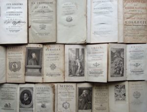 11. ÉDITIONS XVIIIe siècle - LITTÉRATURE. Réunion d’ouvrages dépareillés ou en état moyen dont : • FÉNELON. Lettres sur divers Sujets concernant la Religion et la Métaphysique. Paris, Delaulne, 1718. In-12, reliure de l’époque veau brun, dos à nerfs orné. Épidermures, petites fentes aux mors, coiffes et coins usés. (24)-278 pp. Papier bruni. Ex-libris : Etienne de l’Espine. • LUCRÈCE. De Natura Rerum Libros sex Interpretatione et Notis illustravit Thomas Creech… Editio altera… Londini, Matthews, Child, Tooke, Clements, Churchill…, 1717. In-8, reliure veau clair, dos à 5 nerfs orné. Épidermures, mors du premier plat fendu, coins usés. 16-(2)-367-(95) pp. Papier bruni. • [MOREL de VINDÉ]. Primerose. Paris, Didot l’Aîné, 1798. In-12, broché. Dos cassé. Illustré d’un frontispice et 3 gravures de Lefèvre en double état avant la lettre. • [M. (le Baron de)]. La Franciade.Poëme. S. l., s. n., 1792. In-8, broché. Sans couverture. 104 pp. • MONTESQUIEU. Œuvres Posthumes de Montesquieu, pour servir de supplément aux différentes éditions in-8° qui ont paru jusqu’à présent. Paris, Plassa, Bernard, Grégoire, An VI - 1798. In-8, reliure veau moucheté dos lisse orné. Dos recollé, cuir dédoublé sur le second plat. 336 pp. Bon état intérieur. • ROUSSEAU (Jean-Jacques). Émile, ou de l’Éducation. Amsterdam, Néaulme, 1762. 2 volumes in-12, reliure de l’époque basane marbrée, dos lisse orné. Épidermures, coins usés. T. 1 : Frontispice, (4)-466 pp. et 1 pl. hors texte T. 2 : Frontispice, (4)-407 pp. • ROUSSEAU (Jean-Jacques). Les Pensées de J. J. Rousseau, Citoyen de Geneve. Amsterdam, s. n., 1764. Suivi de : Discours sur l’Économie Politique. Amsterdam, s. n., 1763. Suivi de : Profession de Foi Philosophique. Amsterdam, Rey, Lyon, Périsse, 1763. Suivi de : Lettre de J. J. Rousseau à Mr de Voltaire. S. n., s. d. Suivi de : Lettre de Rousseau qui contient sa Renonciation à la Société civile, … S. n., s. d. In-12, reliure de l’époque veau brun, dos lisse orné. Épidermures et manque au dos, mors en partie fendus, coiffes arasées, coins usés. Frontispice (portrait d’après De la Tour), 311-67-35-56-16 pp. Rousseurs et qq. taches sur le premier livre, les yeux du portrait ont été grattés. • TASSO (Torquato). Aminta. Favola Boscareccia. Paris, Thomas Jolly, 1700 (titre gravé). Venise, Gabriel Hertz, 1705 (page de titre). In-32, reliure basane marbrée, dos à 4 nerfs orné de fleurons à froid. Caisson inférieur abîmé, épidermures. 92 pp. dont titre gravé et 6 gravures à pleine page par Antonio Luciani. Manque l’angle d’un feuillet avec manque des dernières lettres des deux premières lignes, rousseurs. Ex-libris : Charles Martyne.