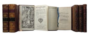 13. ÉDITIONS XVIIIe s. LITTÉRATURE & PHILOLOGIE. Réunion d’ouvrages provenant de la bibliothèque de Léo Larguier : • SABATIER de CASTRES (Abbé). Dictionnaire de Littérature dans lequel on traite tout ce qui a rapport à l’Éloquence, à la Poésie & aux Belles-Lettres… Paris, Vincent, 1770. 3 volumes in-8, reliure de l’époque, veau brun marbré, dos lisse orné. Petits trous de vers au dos des tomes 2. et 3. Frontispice au tome 1. Bon état général. Edition originale. Exemplaire de Léo Larguier avec sa signature et la date 1935 sur la contregarde du tome 1. • [CARACCIOLI (Louis Antoine de)]. Dictionnaire Critique, Pittoresque et Sentencieux, propre à faire connaître les usages du Siècle, ainsi que ses bizzareries, par l’Auteur de la Conversation avec soi-même. Lyon, Benoit Duplain, 1768. 3 volumes in-12, reliure de l’époque veau brun, dos à 5 nerfs orné. Qq. frottements, coins émoussés. Exemplaire de Léo Larguier avec sa signature sur la contregarde du t. 1. • [RIVAROL]. De l’Universalité de la Langue Française Discours qui a remporté le prix à l’Académie de Berlin en 1784. Seconde édition. Berlin, Paris, Prault, Bailly, 1785. Suivi de : Traité des Négations de la Langue Françoise. Paris, Guillot, 1780. In-12, reliure veau marbré, dos lisse orné. (4)-148 pp. 64-(6) pp. Qq. rousseurs. Vignette sur le contre plat représentant Enguerrand de Monstrelet. Exemplaire de Léo Larguier avec sa signature et la date 1933 en page de garde. Ex-libris : cachet J. E. Sœhnee en page de titre.