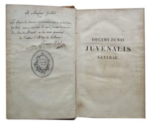 15. JUVENAL. Réunion d’ouvrages : • JUVENAL. PERSE. D. Junii Juvenalis et A. Persii Facci Satyræ, omni obscoenitate Expurgatæ A. R. P. Josepho Jouvencio. Rhedonis (Rennes), Vatar, 1735. In-16, reliure de l’époque veau brun, dos à 5 nerfs orné, petites fleurs au centre et dans l’angle des plats encadrés d’un filet doré. 102 pp. Papier bruni. Édition en petits caractères des Satires de Juvénal et Perse. • JUVENAL. Decimi Junii Jusvenalis Satirae, ad codices parisinos recensitae lectionum varietate et commentario perpetuo illustratae a Nic. Lud. Achaintre accedunt Hadr. et C. Valesiorum notae adhuc ineditae. Parisiis, sumptibus et typis Firmini Didot. 1810. 2 volumes in-8, reliure veau brun, dos lisse orné, frise en encadrement Reliures très abîmées avec manques, mors fendus. Rousseurs. Illustré d’un frontispice en tête de chaque volume. Ex-libris : Bibliothèque Docteur Lalou. Ex-dono manuscrit en page de garde signé Firmin-Didot : A Monsieur Guillard. La façon de donner vaut mieux que ce qu’on donne, / Guillard, mais je ne sais lequel j’aime le mieux / Du livre de Stuart, ou des vers gracieux / de l’auteur d’Œdipe à Colonne.
