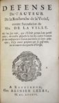 17. [MALEBRANCHE (Nicolas)]. Traité de la Nature et de la Grace, par l’Auteur de la Recherche de la Vérité. Dernière Edition, augmentée de plusieurs Eclaircissemens qui n’ont point encore paru. Amsterdam, Reinier Leers, 1684. Suivi de : Défense de l’Auteur de la Recherche de la Vérité contre l’Accusation de Mr. de La Ville. Où l’on fait voir, que s’il était permis à un particulier, de rendre suspecte la Foi des autres hommes sur des consequences bien ou mal tirées de leurs principes, il n’y aurait personne qui se pust mettre à couvert du reproche d’hérésie. Amsterdam, Reinier Leers, 1684. In-12, reliure veau brun, dos à 5 nerfs orné. Épidermures, coiffes arasées, coins usés. (16)-336-(3)-46 pp. Bon état intérieur. Nouvelle édition, en partie originale (augmentée de 4 Éclaircissements) de ce célèbre traité sur la philosophie religieuse de Malebranche (1638-1715) dont la première édition parut en 1680 et qui fut mis à l’index en 1690. Brunet, III, 1335 Barbier, IV, 762.