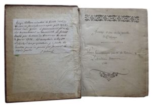 25. VOLTAIRE et alii. La Pucelle d’Orléans et divers textes. Copie manuscrite. [Genève], s. d. (1755 - seconde moitié XVIIIe s.). In-8, reliure basane tachetée, dos à 5 nerfs orné de filets en pointillés, ligne de pointillés en encadrement sur les plats. Usures. Manuscrit de deux ou trois écritures différentes, (2)-478 pp., comprenant une trentaine de pièces dont : Jeanne d’Arc ou La Pucelle d’Orléans (1755) Épître de Belzebuth à Voltaire sur le poème de la Pucelle, p. 381 Envoy du Poème de la Pucelle d’Orléans à une Dame, p. 391 Lettre de Mr Voltaire à Monsieur Tronchin du 4 avril 1756, p. 392 … Vers contre le Roy de Prusse, p. 410 … Chanson contre le Maréchal de Richelieu 1757, p. 424 Ode de Voltaire sur sa Conversion, p. 426 Madrigaux (1 à 26), p. 434 Vers faits sur les sept péchés capitaux par M*** proposés par sept dames qui voulaient l’embarasser…, p. 455 Très humbles remontrances adressées à Mr le Controlleur Général par les filles du monde au sujet des Reformes faittes dans la finance, p. 461… Vers faits pour M. de Voltaire le 30 mars 1778 par Mr St Marc sur son couronnement à la Comédie française et Réponse de Mr de Voltaire, p. 478. Copie genevoise comportant une note manuscrite signée J. Gaberel collée sur le contreplat : Lorsque Voltaire eut achevé la Pucelle d’Orléans, ses amis en firent plusieurs copies qu’ils repandirent dant Geneve. Le Gouvernement fit rechercher soigneusement ces manuscrits, il furent brûlés par la main du bourreau au mois de janvier 1756. Cet exemplaire echappa - et plus tard son proprietaire y ajouta les diverses pièces de poesie qui forment la seconde partie. Jean Gaberel (1810-1889), pasteur et historien, est l’auteur de volumes sur Voltaire et Rousseau. Provenance : Anatole France avec une note de sa main indiquant : cette copie manuscrite de la Pucelle en quatorze chants, bien que datée de 1755 n’est pas copié (sic) sur les imprimés qui avaient paru à cette date, du moins pour le quatorzième chant. Une notice de J.-L. Debauve confirme cette provenance : Vente des livres de La Béchellerie, 18 et 19 mai 1981. Lot hors catalogue.
