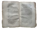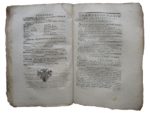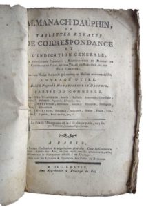 26. ALMANACH. [ROZE de CHANTOISEAU (Mathurin)]. Almanach Dauphin, ou Tablettes Royales de Correspondance et d’indication générale, des principales Fabriques, Manufactures et Maisons de Commerce de Paris, autres Villes du Royaume, et des Pays Etrangers. Avec une Notice des motifs qui rendent ces Maisons recommandables. Ouvrage utile dédié & présenté à Monseigneur le Dauphin. Paris, Au Bureau d’indication et négociations générales… 1789. In-8, broché. Couverture d’attente (dos anciennement renforcé). Non paginé (env. 436 pp.). Qq. rousseurs. Non rogné (tel que paru). L’ouvrage comporte le Privilège, une épître dédicatoire au Dauphin signée Roze de Chantoiseau (connu comme « l’inventeur » du restaurant vers 1765), le calendrier de l’année 1789, de nombreuses rubriques détaillant les noms des fabriques et négociants de draperie, soierie, toilerie, bonneterie, chapellerie, pelleterie papeterie, librairie, mercerie, orfèvrerie, joaillerie, bijouterie, horlogerie, clincaillerie, épicerie, droguerie, parfumerie, etc… classées par ville françaises et étrangères. In fine sont consignés les Départ et arrivée des diligences, carrosses, berlines et messageries royales de France, Départ et arrivées des courriers de la poste aux lettres pour toute l’Europe. Les « Tablettes de renommée » - correspondant aux différents corps de métier, vendues par livraison, parurent pour la première fois en 1768-1769. Grand-Carteret, 413, 457.