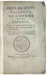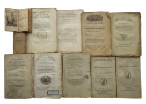 31. [PÉRIODE RÉVOLUTIONNAIRE]. CONSTITUTIONS. Réunion d’ouvrages dont : • BOISSY D’ANGLAS. Projet de Constitution pour la République Française, et Discours préliminaire prononcé par Boissy d’Anglas, au nom de la Commission des Onze … dans la séance du 5 Messidor, an III. Nantes, Malassis, Messidor an III. In-8, broché. Sans couverture. (2)-162 pp. Légères traces de mouillure, faux-titre un peu poussiéreux. Non rogné. • Constitution de la République Française. Nantes, Malassis, réimpression an VIII. In-8, broché. Sans couverture. 22 pp. Déchirure de 7 cm sans manque sur un feuillet. • BORRELLI. A L’Assemblée Nationale, sur les Moyens de former la Constitution et les Loix, sans tumulte, sans confusion, & avec toute la décence qui doit caractériser des Législateurs. Ouvrage publié et présenté par M. Hugou de Bassaville… Paris, Barrois, 1789. In-8, broché. Sans couverture. 32 pp. • SMITH (J.). Remarques sur la Constitution de 1791. Traduites de l’Anglois par le citoyen Maudru. Paris, Imp. Nationale, s. d. In-8, broché. Sans couverture. 14 pp. Trace de mouillure. • La Constitution Française, Présentée au Roi par l’Assemblée Nationale le 3 Septembre 1791, et acceptée le 14 du même mois. Besançon, Simard, 1791. In-8, broché. Sans couverture d’attente. 69 pp. Page de titre et marges un peu salies. • Constitution de la République Française. Bruxelles, G. Huyghe, Vendémiaire, an IV. In-8, broché. Sans couverture. 46 pp. Court en tête. • Constitutie der Fransche Republieke. Brussel, G. Huyghe, Vendémiaire, IVde jaer. In-8, broché. Sans couverture. 48 pp. • Déclaration des Droits de l’Homme et du Citoyen, Mise à la portée de tout le monde, et comparée avec les vrais principes de toute Société. Strasbourg, De l’Imprim. de la Société typographique, s. d. In-8, broché. Couverture d’attente. 66 pp.