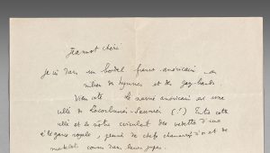 Viens vite. Le navire américain est une ville de Locorbusier-Saunier (!) [l'architecte Charles-Édouard Jeanneret et le peintreAmédée Ozenfant, qui publièrent en 1923 sous le pseudonyme collectif Le Corbusier-Saugnier un important ouvrage intitulé Vers une architecture]. Entre cette ville et la notre circulent des vedettes d'une élégance royale, pleine de chefs chamarrés d'or et de matelots cousus dans leurs jupes. Le changement de bocal m'éprouve. L'eau propre est trop propre. J'ai mal partout et je dors. maman et toi, voiLà Les points fixes autour DesqueLs j'essaye De bâtir un univers réeL. L'état De songe, D'irréaLité me tue. Que faire ? J'envie tes bonnes joues, ta paille et ton crottin. je ne savais pas que g. mourait d'amour [probablement l'écrivain américain Glenway Wescott, tombé amoureux de Jean Bourgoint]. Il pleure. Ne le traite pas trop par dessous la jambe. Il m'effraye à force de "réalisme", de sens de la vie et de gout des choses. Tu es fou de croire que tu me gênerais. Tu habiteras ma chambre. Quel bonheur ! Jean [La signature est précédée du dessin d'un creur.] »