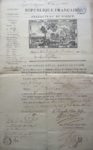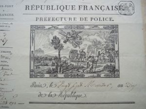 39. PASSEPORT. Juillet 1802. Grand passeport (46,5 x 28,5 cm) avec bel en-tête sur bois gravé, daté du 27 Messidor an 10 décerné au citoyen Bérard Desglajeux natif de St Domingue, demeurant à Paris, allant à St Domingue par Le Havre, accordé pour 3 mois. Trou au centre du document (restauré) avec perte d’un mot. Signatures : Denis Decrès, Ministre de la Marine et des Colonies Louis Nicolas Dubois, Préfet, Conseiller d’état Püs, secrétaire général de la Préfecture de police.