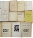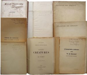 47. GONCOURT (Edmond et Jules). Réunion d’ouvrages : • Histoire de Marie-Antoinette. Paris, Firmin Didot, 1858. In-8, reliure (signée Lamy à Nogent-le-Rotrou) demi-chagrin brun, dos à 4 nerfs, initiales P. C. en pied. Qq. frottements, deux petits trous de vers sur le mors du second plat. (4)-429 pp. Rousseurs sur les premiers ff. Édition originale avec un envoi sur le faux-titre : A notre ami Ph. de Chennevière ses amis E et G de Goncourt. Vicaire III, 1035. • Quelques Créatures de ce Temps. Nouvelle Edition. Paris Charpentier, 1876. In-8, (dé)broché. Dos cassé, plats de couverture détachés avec bordures déchirées. (8)-348-(4) pp. Témoins conservés (déchirure). Nouvelle édition de Une Voiture de masques publié en 1856 avec un envoi signé d’Edmond de Goncourt à Ph. Burty son ami sur le faux-titre. Un des 25 ex. numérotés sur papier de Hollande, seul grand papier. • La Saint-Huberty d’après sa correspondance et ses papiers de famille. Paris Dentu, 1882. In-8, anciennement relié (dos et un plat manquant). Frontispice (par Lalauze), (4)-258-(2) pp. et 1 f. fac-similé. Texte encadré. Envoi signé en page de garde : à M. G. Berardi hommage de l’auteur. • Outamarao. Le peintre les maisons vertes. L’art japonais au XVIIIe siècle. Édition définitive. Paris, Flammarion, Fasquelle, s d. In-12, broché. Frontispice, 276-(1) pp. • DEFFOUX (Léon). L’Immortalité Littéraire selon M. de Goncourt suivie d’une petite chronologie du Testament et de l’Académie Goncourt. Paris, Delesalle, 1918. In-8, broché. 44-(3) pp. Envoi de l’auteur à Oswald Wirth. • DEFFOUX (Léon). Des Origines de l’Académie Goncourt. Edmond de Goncourt suivi du texte intégral du Testament … Paris, Extrait du Mercure de France, 1921. In-8, broché. 31-(1) pp. Tiré à 500 ex. numérotés et signés par l’auteur. • Eloge de M. Riccoboni. Eloge de Mme Riccoboni. (1773). 2 plaquettes in-8, cartonnage demi-maroquin, titre doré au dos. 16 et 11 pp. Mention manuscrite à l’encre rouge par Edmond de Goncourt (avec sa signature) : tirée du nécrologe sur les deux plaquettes. • Collection des Goncourt. Objets d’art du XVIIIe siècle. 22, 23 et 24 février 1897. Commissaire-priseur : Duchesne. Expert : Danlos. Gravures du XVIIIe siècle. 26, 27 et 28 avril 1897. Commissaire-priseur : Duchesne. Expert : Mannheim. 2 volumes in-4, brochés. 43 et 67 pp. Déchirure sur une couverture, manque un frontispice. Adjudications et nom des acquéreurs sur un catalogue parmi lesquels G. Hugo, Vve Dumas, Daudet, Ch. Picard…