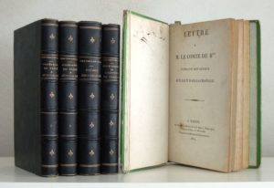 48. [CHATEAUBRIAND]. [HIS (Charles)]. Lettre à M. le Comte de B*** pendant son séjour aux Eaux d’Aix-la-Chapelle. Paris, J.-G. Dentu, 1812. [Suivi de] DAMAZE de RAIMOND. Réponse aux Attaques dirigées contre M. de Chateaubriand, accompagnée de pièces justificatives. Paris, Le Normant, 1812. [Suivi de] CHATEAUBRIAND (M. de). Du Sacerdoce, ou Fragment d’un ouvrage publié à Londres. Paris, Laurent-Beaupré, 1814. In-8, reliure à la Bradel papier vert (frotté), titre à l’encre au dos. Coins usés. 40-(2)-160-30 pp. Du Sacerdoce… correspond aux chapitres 48 et 49 de l’Essai sur les Révolutions… Édition originale de l’ouvrage de Ch. His dirigé contre Chateaubriand avec un envoi de l’auteur à son fils. Barbier II, 1111. • On joint : CHATEAUBRIAND (Vicomte de). Études ou Discours Historiques sur la Chute de l’Empire Romain… Analyse Raisonnée de l’Histoire de France et Fragments depuis Philippe VI jusqu’à la Bataille de Poitiers… Itinéraire de Paris à Jérusalem… (2 vol.). Paris, Firmin Didot, 1845-1850. 4 volumes, reliure demi-chagrin bleu nuit, dos à 4 nerfs orné. Qq. rousseurs. Bon état.