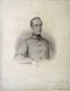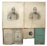 52. LAMARTINE (Alphonse de). Réunion de deux portraits signés, un volume et une plaquette : • LÉVY (Gustave). Portrait de Lamartine. Imp. Brebant. Réunion de deux gravures sur Chine appliquées (33 x 26 cm, cartons recoupés) par Gustave Levy (1819-1894) d’après Leloir. L’une avec trace de mouillure et qq. salissures, l’autre avec rousseurs, chacune portant un envoi signé de Lamartine : Madame Bernig (ou Reinig ?) hommage respectueux Monsieur Satel hommage. • LAMARTINE (Alphonse de). Chant du Sacre ou la Veille des Armes. Paris, Baudouin frères et Urbain Canel, 1825. In-8, reliure demi-basane fauve, dos lisse. Dos très épidermé avec manques, mors fendus, manque de papier sur les plats, coins usés. (4)-64-(4)-vii-(5)-198-(2) pp. • LAMARTINE (Alphonse de). Méditations Poétiques. 18e édition. Paris, Gosselin, 1830. In-16, reliure demi-basane verte, dos lisse orné. Mors et coiffes frottés, petite galerie de ver sur le mors du premier plat. xvii-262 pp. Jolie vignette de titre. Préface de Charles Nodier. Ex-libris : Léon Duchesne de la Sicotière. • SORIN (Élie). Lamartine. Extrait du Journal L’Ouest. 1869. Plaquette in-8, brochée. 14 pp. Envoi sur le faux-titre et l.a.s. de l’auteur à Jules Grévy.