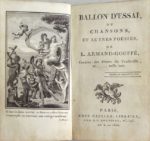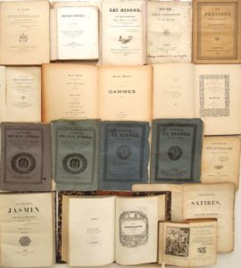 58. POÉSIE XIXe s. Réunion de volumes reliés et brochés dont : •  BERQUIN. Pygmalion, Scène lyrique de Mr J.-J. Rousseau. Illustrations de Moreau le Jeune. Suivi d’une Idylle par Berquin. Vignette de Marillier. Réimpression textuelle sur l’édition originale de 1775. Paris, Lemonnyer, 1883. In-4, broché. Couverture un peu salie, dos cassé, manque le second plat. Réimpression tirée à 525 ex. dont celui-ci, un des 100 ex. sur Japon avec les gravures en trois état (noir, bistre et sanguine). • JASMIN. Las Papillotos. T. 1 : 1825-1843. Augmenté de 24 poèmes nouveaux. T. 2 : De 1835 à 1842. 3e édition. Agen, Prosper Noubel, 1843-1858. 2 volumes in-8, reliure demi-basane caramel, dos lisse souligné de filets dorés. Chasses du tome 1 agrandies pour égaler le format du tome 2. T. 1 : Frontispice par Montaut d’Oléron, xxxix-(1)-432 pp. Qq. rousseurs, un feuillet jauni, les autres bien blancs. T. 2 : vii-33-(3)-400 pp. Qq. rousseurs et ff. un peu brunis, qq-uns aux marges plus courtes. Le tome 2 contient Bibliographie patoise par Charles Nodier, le portrait de Jasmin par Sainte-Beuve, L’Abuglo de Castèl-Cuillé (Agen, Noubel, 1936), etc. Édition bilingue avec le texte français en regard du gascon. • MERRILL (Stuart). LES GAMMES (VERS). Paris, Vanier, 1887. In-8, reliure à la Bradel papier brique, titre doré au dos. 60-(1) pp. Couvertures conservées. Qq. ff. jaunis. Edition originale de ce premier recueil de Stuart Merrill (1863-1915), poète symboliste américain d’expression française. • [PEIGNOT (Gabriel)]. LA CREATION ET LE PARADIS PERDU. Pot-pourri. Par un Bourguignon. Bagdad, s. d. (vers 1807). In-16, reliure signée Belz-Niedrée demi-maroquin noir, dos à 6 nerfs, tête dorée. Nerfs frottés. 20 pp. Édition tirée à petit nombre de ces œuvres en vers du bibliographe dijonnais Étienne-Gabriel Peignot (1767-1849). Barbier I, 814. • TRIBOULET. LA VRAIE HISTOIRE DE TRIBOULET et autres poésies inédites recréatives, morales et historiques des XVe et XVIe siècles recueillies et mises en ordre par A. Joly. Lyon, Scheuring, 1867. In-8, reliure (signée A. Bertrand) demi-maroquin bordeaux à coins. Coiffes, nerfs et mors frottés, qq. épidermures, coins usés. 126-(1) pp. Édition tirée à 282 ex. dont celui-ci, un des 250 ex. sur papier teinté. • VILLENAVE Fils (Th.). LES HIBOUX, ou La Noctimanie. Poëme héroïque en un Chant. Paris, Dupont, 1827. Plaquette in-8, brochée. Couverture d’attente. 16 pp. • VIOLLET Le DUC. NOUVEL ART POETIQUE. P., Martinet, 1809. In-12, broché. (4)-68 pp. Qq. rousseurs. Édition originale.