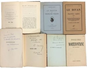72. CARCO (Francis). Réunion d’ouvrages (8 vol.) dont : • Petits Airs. Poèmes ornés d’un bois gravé par Deslignères et d’un dessin hors texte de Maurice Barraud. Paris, Ronald Davis, 1920. In-12, reliure (signée Aussourd) demi-maroquin lie-de-vin à coins, dos à 4 nerfs, tête dorée. Couvertures et dos conservés. Édition originale tirée à 350 exemplaires numérotés dont celui-ci, un des 300 exemplaires sur papier pur chiffon (n° 319). Avec un envoi autographe signé sur le faux-titre : à Curnonski son vieux frangin… ski l’admire 18 quai du Louvre. • La Rose au Balcon. Poésies. Paris, Chabaneix, 1936. In-8, broché. Un des 185 ex. sur papier bleu-vert de Montval. Envoi à Léo Larguier sur le faux-titre. • Francis Carco Poëte. Revue Le Divan, n° 143.