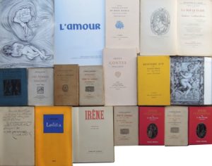 75. CURIOSA. Réunion d’une vingtaine de volumes dont : • [ARAGON]. Irène. L’Or du Temps, Deforges, Achevé d’imprimer du 5 janvier 1968. Exemplaire du Service de Presse. Couverture défraîchie. • [ARAGON]. Irène. L’Or du Temps, Deforges, 6 mars 1968. Bel exemplaire. • PETER (René). La Dame aux Repentirs. L’inspiratrice des liaisons dangereuses. Librairie des Champs Elysées, 1939. In-8, broché. Un des 10 exemplaires de tête sur Arches, n° 1. Bel envoi à Albert Pigasse. • RONSARD (Pierre de). La Bouquinade & Autres Gaillardises. Paris, Bibliothèque des Curieux, 1921. • RÉAGE (Pauline). Histoire d’O. Sceaux, Pauvert, octobre 1954. • Catalogue d’exposition. Les Peintres Témoins de leur Temps. L’Amour. XIIIe Exposition au Musée Galliera en 1964. In-4, en ff., couverture bleue, chemise et étui toile grise. 14 textes et 48 dessins. Un des 1000 ex. numérotés.