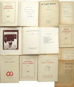 79. FOLLAIN (Jean). Réunion d’ouvrages : • Le Gant Rouge. Paris, Ed. Sagesse, Aux quatre Chemins, s. d. Feuillet replié, 8 pp. • Tout Instant. Poèmes en prose. Paris, NRF, 1957. In-12, broché. Non coupé. Édition originale tirée à 35 ex. sur pur fil Lafuma, dont celui-ci, un des 30 ex. numérotés (et 5 hors commerce). • Des Heures. Poèmes. Paris, NRF, 1960. In-12, broché. Ex. sur papier d’édition avec un envoi à Marie-Jeanne Durry. • Des Heures. Poèmes. Paris, NRF, 1960. In-12, broché. Ex. sur papier d’édition avec un envoi à Jules Romains. • Appareil de la Terre. Poèmes. Paris, NRF, 1964. In-8, broché. Non coupé. Édition originale tirée à 34 ex. numérotés sur pur fil Lafuma-Navarre, papier de tête, dont celui-ci. • Appareil de la Terre. Poèmes. Paris, NRF, 1964. In-8, broché. Non coupé. Édition originale sur papier d’éditon avec un envoi à Marie Jeanne Durry. • Espaces d’Instants. Poèmes. Paris, NRF, 1971. In-8, broché. Non coupé. Édition originale tirée à 30 ex. numérotés sur pur fil Lafuma,-Navarre, papier de tête, dont celui-ci. • Falloir Vivre. Gravure de J. Damville. Commune Mesure, 1976. In-8, broché. Gravure signée par Jacques Damville en frontispice. Édition originale tirée à 100 ex. sur Johannot, dont celui-ci. • On joint : Jean Follain. La Peau de Chagrin, s. d. Texte de Y. Delétang-Tardif et poèmes de Follain. 8 pp. (marges abîmées). • DEBREUILLE (Jean Yves). Jean Follain, un Monde peuplé d’attente. Marseille, Autres Temps, 1995. • COLLECTIF. Visages de Jean Follain. La Barbacane, 1971.