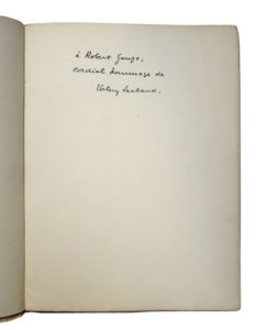 82. LARBAUD (Valery). Notes sur Racan. Maestricht, Stols, 1928. In-8, broché. 49-(3) pp. Ces Notes de Larbaud constituaient le tome 2 d’une édition des Poésies lyriques profanes de Racan. Édition originale tirée à 350 ex. numérotés dont celui-ci, un des 300 ex. sur vergé anglais. Envoi de Larbaud à Robert Ganzo en page de garde.