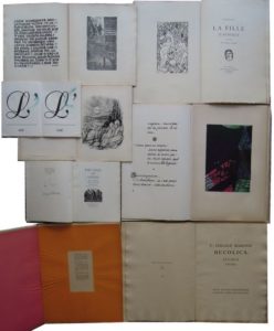 84. LIVRES D’ARTISTE & ILLUSTRÉS XXe s. Réunion d’ouvrages : • BLAINE (Julien). Elle Apostrophe. Akenaton, 1988. In-8, en ff. Tiré à 200 ex. numérotés sur vélin d’Arches dont celui-ci. Recueil de différents mots précédés d’un « L’ », chaque apostrophe étant rehaussé d’une touche de couleur. • COLLECTIF. Via Appia. Quelques essais d’épigraphie lapidaire exposés au premier Salon de l’Art mural (Paris 1935). Associacion de Amigos del Libro de Arte, Impreso para Serafin y Joaquin Alvarez Quintero, 1935. In-folio, chemise éditeur (un peu défraîchie). Recueil de 19 épigraphies présentées dans des chemises de couleur numérotées. Préface d’Eugénio d’Ors, inscriptions dues à d’Annunzio, Laprade, Marsan, Mistral, P.-J. Toulet, Paul Valéry…Typographie de GLM. Édition tirée à 300 ex. numérotés sur Japon dont celui-ci (n° 222). • FAVRE (Louis). Le Noyé de l’Épave. S. l., 1951. In-plano, en ff. Déchirure de qq. cm en pied du premier plat de couverture. Texte tiré en lithographie et 5 pl. lithographiées en couleurs. Édition originale tirée à 100 ex. numérotés dont celui-ci, un des 80 ex. sur vélin de Rives (n° 64), signé par Louis Favre, auteur du texte et des illustrations. • GIELGUD (Lewis). The Vigil of Venus (Pervigilium Veneris). Wood-engravings by George Buday. London Frederick Muller, s. d. (19). In-4, cartonnage éditeur dos toilé, titre doré au dos, étiquette sur le plat. 49-(1) pp. Bois gravé dans le texte. Poème en latin avec la traduction anglaise en regard. Bon exemplaire. Tiré à 250 ex. numérotés dont celui-ci, signé par l’auteur et l’artiste, dédicacé par Maina Gielgud à Marcel et Juliette Achard. • MICHAEL (Roger). Signes. Pointe-sèche originale de René Demeurisse. Paris, 1958. In-folio, en ff. Poème extrait de l’ouvrage tiré Télécommunications. Tiré à 200 ex. numérotés sur vélin d’Arches à la cuve dont celui-ci. • STÄMPFLI (Pierre). 22 avril 1964. Grand livret d’invitation, en partie calligraphié et en partie xylographié, pour le vernissage de la première exposition parisienne des toiles récentes de l’artiste à la Galerie Ror Wolmar le 22 avril 1964. 12 ff. sur papier chiffon illustré de 2 reproductions en noir à pleine page et une grande reproduction en couleurs contrecollé. Invitation nominative pour le critique d’art Pierre Imbourg signée par le peintre suisse Pierre Stämpfli (1916-1975). • VIRGILE. La Fille d’Auberge illustrée par Gabriel Fournier. Paris, Jacques Haumont, 1945. In-folio, en ff. sous couverture illustrée.Traduction par André Berry. Édition tirée à 388 ex. dont celui-ci, un des 350 ex. sur vélin pur fil d’Annonay, illustré de bois gravés en frontispice et dans le texte. • VIRGILE. Bucolica. Egloga Prima. Paris, Apud Govone Bibliopolam, 1930. In-folio, broché. Gardes brunies. (12 pp.). Impression en noir et rouge. Belle impression de la première églogue en latin tirée à 106 ex. numérotés dont celui-ci, pour célébrer le second millénaire de Virgile.