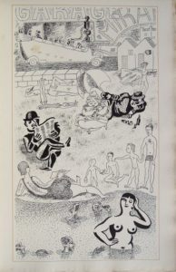 92. SALMON (André). CHARBONNIER (Pierre). Les Noces Exemplaires de Mie Saucée ou Les Nouvelles Métamorphoses de MM. Quasi, Total, Agénor de Jussieu et frère Gabier sous les Contrôle et Présidence de l’Homme qui bêche. Paris, Éditions de la Fanfare de Montparnasse, 1936. In-4, broché. Couverture rempliée. (4)-71-(2) pp. Texte en noir et en couleurs illustré de 15 compositions en noir de Charbonnier à pleine page. Qq. rousseurs sur les premiers et derniers ff., petite déchirure d’un cm en pied d’un f. Complet du prospectus avec la photo des deux auteurs par Berenice Abbott et le fac-similé de leurs écritures mêlées. Édition originale tirée à 49 ex. h. c. et 301 ex. numérotés dont celui-ci.