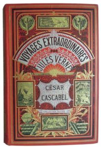 99. VERNE ( Jules). César Cascabel. 85 dessins de Georges Roux. 12 grandes gravures en chromotypographie, 2 grandes cartes en chromolithographie. Paris, Hetzel, 1890. Grand in-8, cartonnage éditeur percaline rouge aux deux éléphants, éventail de couleur argentée. Déchirure de 4 cm en pied du mors du second plat, coins émoussés, qq. légers frottements sur le plat, gouttière bien conservée. Manque l’angle d’un feuillet (suite à une pliure) touchant la première ligne de texte, qq. rousseurs. Catalogue FN avec les Nouveautés pour 1890-1891. Première édition grand in-8 illustrée. Ce cartonnage a été utilisé uniquement pour ce titre. Jauzac 260.