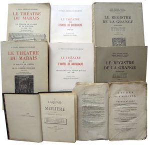 107. [MOLIÈRE]. Réunion d’ouvrages et études dont : • DEIERKAUF-HOLSBOER (S. Wilma). Le Théâtre de l’Hôtel de Bourgogne. 1548-1635. Le Théâtre de la Troupe royale 1635-1680. Paris, Nizet, 1968-1970. 2 volumes in-4, brochés. 219-(2) pp. et 6 planches hors texte et 237-(2) pp. et 7 pl. hors texte. • DEIERKAUF-HOLSBOER (S. Wilma). Le Théâtre du Marais. La période de gloire et de fortune 1634-1648. T. 2 : Le berceau de l’Opéra et de la Comédie française 1648-1673. Paris, Nizet, 1954-1658. 2 volumes in-4, brochés. 231-(1) pp. et 12 planches hors texte et 360 pp. et 11 pl. hors texte. • YOUNG (Bert Edward) et (Grace Philputt). Le Registre de La Grange. 1659-1685. Reproduit en fac-similé avec un index et une notice sur La Grange et sa part dans le théâtre de Molière. Paris, Droz, 1947. 2 volumes in-4, brochés. (8)-385-(2) et 185-(4) pp. et planches hors texte. L’un des meilleurs acteurs du théâtre de Molière et porte-parole de la troupe, biographe digne de foi, contemporain de l’écrivain • MONVAL (Georges). Le Laquais de Molière. Paris, Tresse et Stock, 1887. In-8, reliure demi-chagrin vert, dos à 5 nerfs orné (dos passé). (6)-141-(1) pp. Exemplaire sur vergé. Édition originale tirée à 400 exemplaires avec envoi de l’auteur à Albin Rousselet sur le faux-titre.