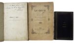 108. PONSARD (François). Réunion d’un jeu d’épreuves et deux ouvrages : • Lucrèce. Tragédie en cinq actes et en vers. Paris, Furne, 1843. Grand in-8, broché. (6)-83-(1) pp. Tache brune marginale sur 6 ff. Épreuves corrigées de la main de l’auteur comportant à presque toutes les pages des corrections essentiellement typographiques, mais également des fautes de frappe et quelques modifications de texte. • Lucrèce. Tragédie en cinq actes et en vers. 4e éd. Paris, Furne, 1843. In-12, reliure veau violet, dos à 4 faux-nerfs orné, jeu de filets dorés en encadrement sur les plats, inscription Pour Mademoiselle Lenoir au centre du premier plat, tranches dorées. Légers frottements sur les coupes. (6)-104 pp. Édition à la date de l’originale de cette pièce du dramaturge François Ponsard (1814-1867) qui fut interprétée par Marie Dorval à l’Odéon. • Charlotte Corday. Tragédie en cinq actes et en vers. 2e édition. Paris, E. Blanchard, 1850. In-8, reliure à la Bradel demi-percaline chocolat, pièce de titre basane verte, fleuron doré au dos. Couvertures conservées. (4)-156 pp. Rousseurs sur l’ensemble du volume. Édition à la date de l’originale avec un envoi signé de l’auteur : A Monsieur Frederick Lemaître hommage d’un de ses admirateurs.