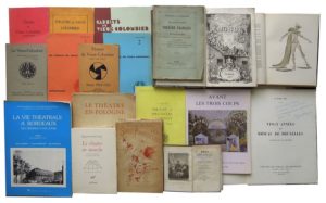 110. [THÉÂTRE]. Histoire du Théâtre, Programmes, Revues. Réunion d’une quarantaine de volumes et fascicules dont : • REVUE. Le Monde Dramatique. Histoire des Spectacles Tome II. Paris, 1835. Grand in-8, reliure demi-veau brun, dos lisse orné. Qq. épidermures, mors fendus. 419 pp. et planches hors texte. Rousseurs. • ESTRÉE (Paul d’). Le Théâtre sous la Terreur. (Théâtre de la Peur). 1793-1794. Paris, Emile-Paul frères, 1913. Grand in-8, broché. ix-523 pp. Rousseurs. • BARRAULT (Jean-Louis). Réflexions sur le Théâtre. Illustrations de Christian-Bérard, Balthus, Brianchon, Cabanne, Coutaud, Jean Hugo, Félix Labisse… Paris, Vautrain, 1949. In-8, broché. (4)-202-(4) pp. Illustrations à pleine page. Non coupé. Édition originale. Un des 800 ex. numérotés sur pur fil Johannot. • [Comédie Française]. Mémoire à Consulter pour les Sociétaires du Théâtre-Français … Paris, Malteste, 1840. In-8, broché. (2)-78 pp. Rousseurs. • [Comédie Française]. Rapport à M. le Ministre de l’Intérieur sur la Comédie Française. 1847. Paris, Imp. Nationale, Mars 1849. In-8, Bradel demi-toile verte à coins. Couvertures conservées. 70 pp. Parmi les membres de la Commission chargée d’examiner la situation actuelle du Théâtre-Français siégeaient le baron de Barante, Victor Hugo, Lamartine, de Morny, Scribe, Buloz… • ROUSSEAU (J.). Code Théâtral, Physiologie des Théâtres. Manuel complet de l’auteur, du directeur, de l’acteur et de l’amateur, contenant les lois, règles et applications de l’art dramatique. Paris, Roret, 1829. In-12, reliure à la Bradel demi-percaline grenat à coins, fleuron doré au dos. Frontispice, (4)-301 pp. Rousseurs. • LAGRAVE (Henri), MAZOUER (Charles), REGALDO (Marc). La Vie Théâtrale à Bordeaux. Des origines à nos jours. Tome 1 : Des origines à 1799. Paris, CNRS, 1985. In-4, broché. 501-(2) pp. Illustrations et fac-similés dans le texte. • LARCHER (Félix) et HUGOUNET (Paul). Les Soirées Funambulesques. Notes et documents inédits pour servir à l’Histoire de la Pantomine. Paris, Ernest Kolb, s. d. In-8, broché. Dos cassé, petites déchirures marginales. Couverture illustrée par Chéret. xv-(1)-226 pp. Illustrations dans le texte. • Théâtre Marigny. Programme. Paris, 1950. In-4, agrafé. Nombreuses photographies de comédiens, publicités… • Théâtre du Vieux Colombier. Réunion d’une vingtaine de programmes et cahiers. Paris, 1913-1968.