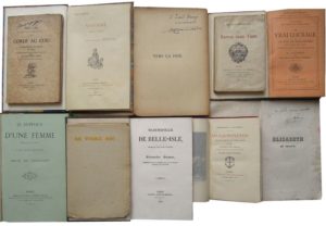 114. [THÉÂTRE]. XIXe siècle. Réunion d’ouvrages : • DUMAS (Alexandre). Mademoiselle de Belle-Isle. Drame en cinq actes, en prose. Paris, Dumont, 1839. In-8, reliure toile verte, dos lisse orné, tranches jaspées. (2)-202-(2) pp. Édition originale. Clouzot, p. 96. • GILL (André). La Corde au Cou. Comédie en un acte en vers. Paris, Marpon et Flammarion, 1876. In-12, broché. Rousseurs en couverture. Frontispice, 53-(2) pp. Édition originale avec une eau-forte d’André Gill. Vicaire III, 979. • GIRARDIN (Émile de). Le Supplice d’une Femme. Drame en trois actes. Avec une préface. Paris, Michel Lévy frères, 1865. Grand in-8, reliure recouverte de papier à la cuve, pièce de titre veau noir. Couvertures conservées. (4)-143 pp. Avec une longue préface de l’auteur. Ex-libris : Jules Claye (Ancien imprimeur). Exemplaire sur papier fort, à la date de l’originale, sans mention d’édition. Vicaire III, 987. • GLAIS-BIZOIN (Al.). Le Vrai Courage ou un Duel en trois parties… Comédie en trois actes et en prose. Paris, Dentu, 1866. In-8, bradel demi-percaline grise. Couvertures conservées. xii-142 pp. • GOURMONT (Rémy de). Le Vieux Roi. Tragédie nouvelle. Paris, Mercure de France, 1897. In-12, broché. Titre en jaune sur le plat. 57-(1) pp. Rares rousseurs. Édition originale, tirée à 300 ex. numérotés dont celui-ci, un des 285 ex. sur alfa numéroté et paraphé par l’auteur au crayon bleu sur le colophon. • GUEULETTE (Thomas-Simon). Arlequin-Pluton. Comédie inédite en trois actes (1719) précédée d’une préface par Charles Gueulette. Eau-forte de Lalauze. Paris, Librairie des Bibliophiles, 1879. In-12, reliure demi-chagrin rouge à coins, dos lisse orné, tête dorée. Petits frottements aux coiffes et coins. Couvertures conservées. Frontispice (eau-forte), (4)-xix-83 pp. Édition originale tirée à 440 ex. dont celui-ci, un des 400 ex. numérotés sur Hollande. Vicaire III, 1152. • LORRAIN (Jean). Viviane. Conte en un acte. Paris, Giraud, 1885. In-8, reliure à la Bradel demi-percaline bleue, pièce de titre marron avec titre en long. Couvertures conservées. 30 pp. Édition originale. • MENDÈS (Catulle). Le Roman d’une Nuit. Comédie. Avec une eau-forte de Félicien Rops. Paris, Doucé, 1883. In-8, broché. Couverture détachée. Frontispice (détaché), 70-(1) pp. Édition originale. • MONSELET (Charles). La Revue sans Titre. Revue de l’année 1876 en deux actes et trois tableaux. Paris, Bachelin-Deflorenne, 1877. In-12, broché. 130 pp. Bon exemplaire. Édition originale sur vergé. • RICHEPIN (Jean). Vers la Joie. Conte bleu en cinq actes, en vers. Paris, Charpentier et Fasquelle, 1894. Grand in-8, broché. Dos en partie cassé. (8)-159 pp. Édition originale avec un envoi de l’auteur à Paul Beuve. • SOUMET (Alexandre). Élisabeth de France. Tragédie en cinq actes. Paris, Boucher, Delaforest, Barba, 1828. In-8, broché. 110 pp. Mouillure en marge des premiers ff., qq. rousseurs. Édition originale. Envoi de l’auteur sur le faux-titre. Vicaire VII, 631.