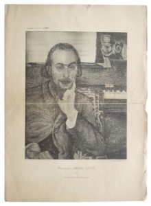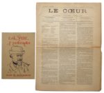 120. SATIE (Erik) in : Le Cœur. Illustré, paraissant tous les mois. Ésotérisme - Littérature - Science - Arts. N° 10. Rédacteur en chef : Jules Bois. Paris, Juin 1895. In-4, en ff. Couverture illustrée d’une grande composition lithograhiée par A. de la Rochefoucauld, séparée du second plat. 8 pp. et une planche hors texte. Pliure centrale et qq. déchirures sommairement restaurées. Dernier numéro de cette très rare revue à parution mensuelle puis aléatoire (seulement 10 numéros parus depuis avril 1893) dirigée par Jules Bois et financée par Antoine de La Rochefoucauld, contenant entre autres : Portrait de Satie par A. de La Rochefoucauld, un texte intitulé Erik Satie par Conrad Satie (son frère), une partition de Satie intitulée Prière des Orgues de la messe des Pauvres, un article de A. de La Rochefoucauld sur Ellen de Villiers de l’Isle-Adam… On joint : Catalogue d’exposition. Erik Satie à Montmartre. Musée de Montmartre, déc. 1982 - avril 1983. In-8, agrafé. 40 pp.