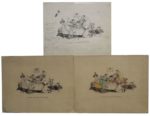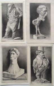 138. GRANDVILLE (Jean-Jacques, Pseudonyme de Jean Ignace Isidore Gérard, 1803-1847). Réunion d’une vingtaine d’estampes ou illustrations (état moyen) dont : • 4 caricatures ou bustes-charges du Muséum Dantanorama par Jean-Pierre Dantan (1800-1869) : Cicéri, Baron Rotschild, Duc de Wellington, Lord Sefton. Lithographies Susse. Marges recoupées. • 2 planches des Singeries Morales Politiques etc. parues dans La Caricature n° 77 et 79. Pliures, qq. rousseurs. • 3 épreuves d’une planche Je crois qu’il est un peu ferme (lith. de V. Ratier) dont l’une avec une liste de corrections manuscrites à effectuer sur l’illustration, une autre rehaussée en couleurs. • 2 couvertures de livraisons des Métamorphoses du Jour en bistre.